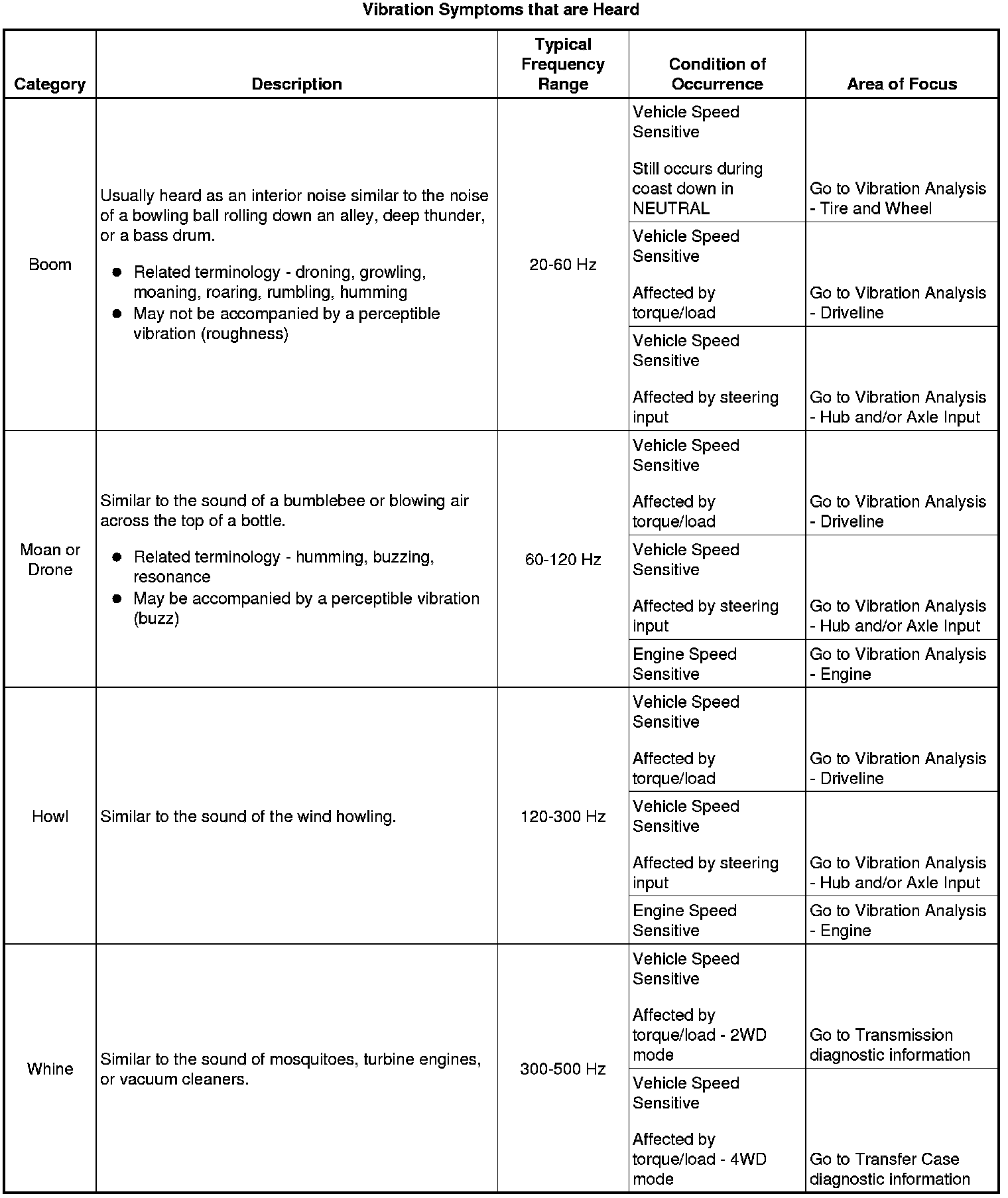 2. Perform the Vibration Analysis - Road Testing Vibration Analysis - Road Testing table before using these symptom tables in order to duplicate and effectively diagnose the customer's concern.