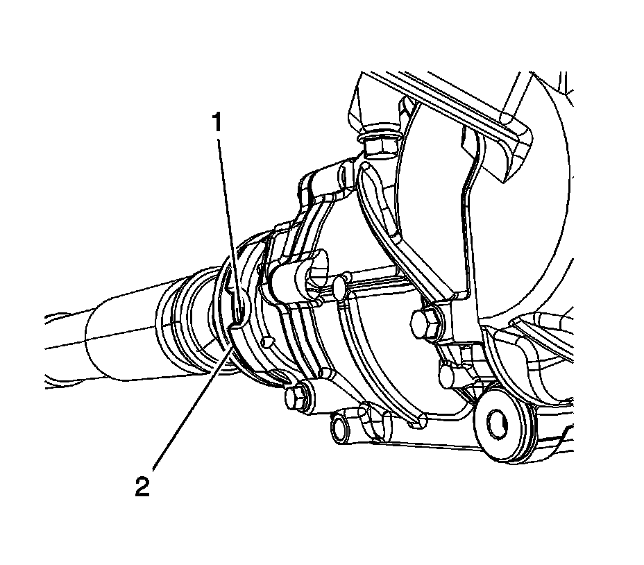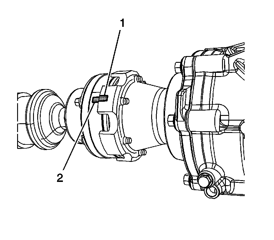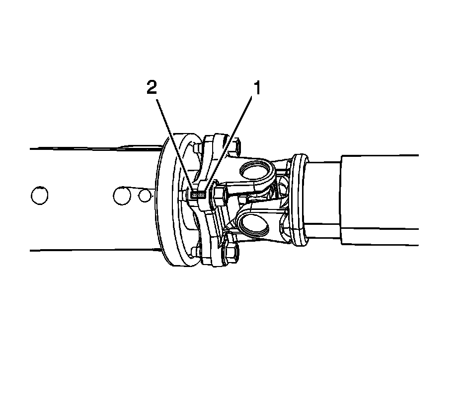 3. Mark the relationship of the rear propeller shaft (1) to the rear differential yoke (2).