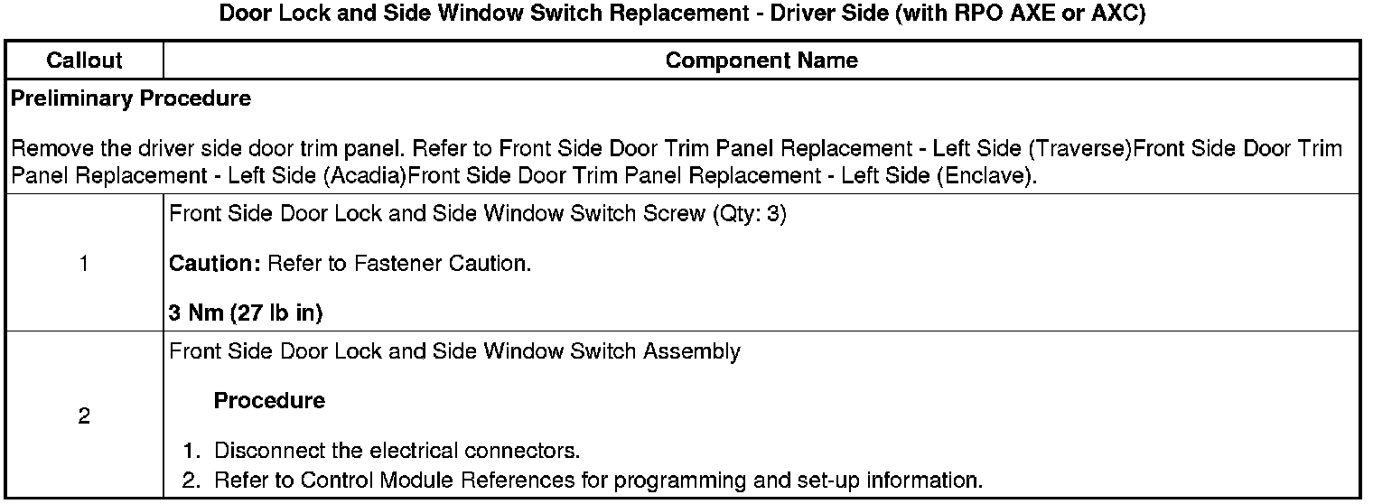 Door Lock and Side Window Switch Replacement - Driver Side (with RPO AXE or AXC)