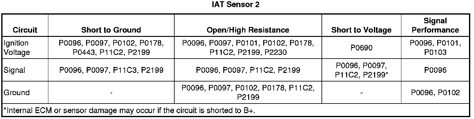 * A slight to moderate resistance in the IAT sensor 1 signal circuit or low reference circuit will increase the range between these two sensors. This condition results in a greater voltage on the IAT sensor 1 signal circuit, which is interpreted by the ECM as a colder IAT sensor.