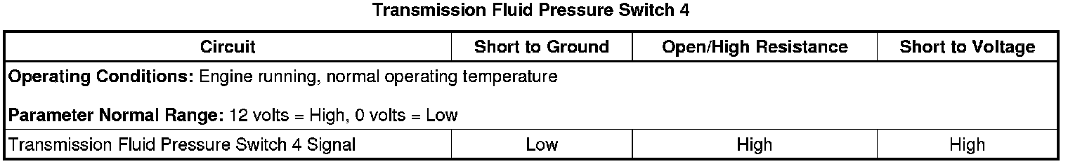 3. Verify the TFP Switch 1, TFP Switch 3, TFP Switch 4, and TFP Switch 5 parameter states are correct for each forward range with the gear select lever in Drive, using the scan tool to command all forward ranges. Refer to Transmission Fluid Pressure Switch Logic Transmission Fluid Pressure Switch Logic