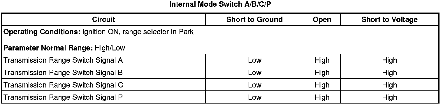 3. Verify the scan tool TCM IMS A/B/C/P parameter values are correct with the gear shift lever in Park, Reverse, Neutral and all forward positions. Refer to Transmission Internal Mode Switch Logic Transmission Internal Mode Switch Logic