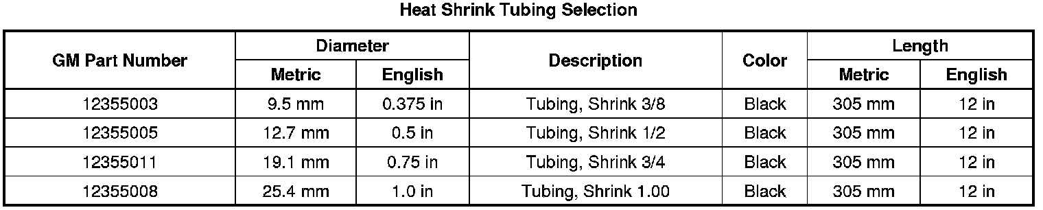 If the wire insulation has been chafed, or broken, enough to show the conductive portion of the wire, and the wire is not damaged, determine the length of insulation that needs to be repaired. If the repair is less than 280 mm (11 in), cut the wire within the damaged area. Then slide the appropriate heat shrink tubing (listed below) over the wire, and repair the wire by splicing the wires together. Refer to Splicing Copper Wire Using Splice Sleeves Splicing Copper Wire Using Splice Sleeves. Once the wire is spliced together slide heat shrink tubing over the damaged area and apply heat to seal the repaired wire.