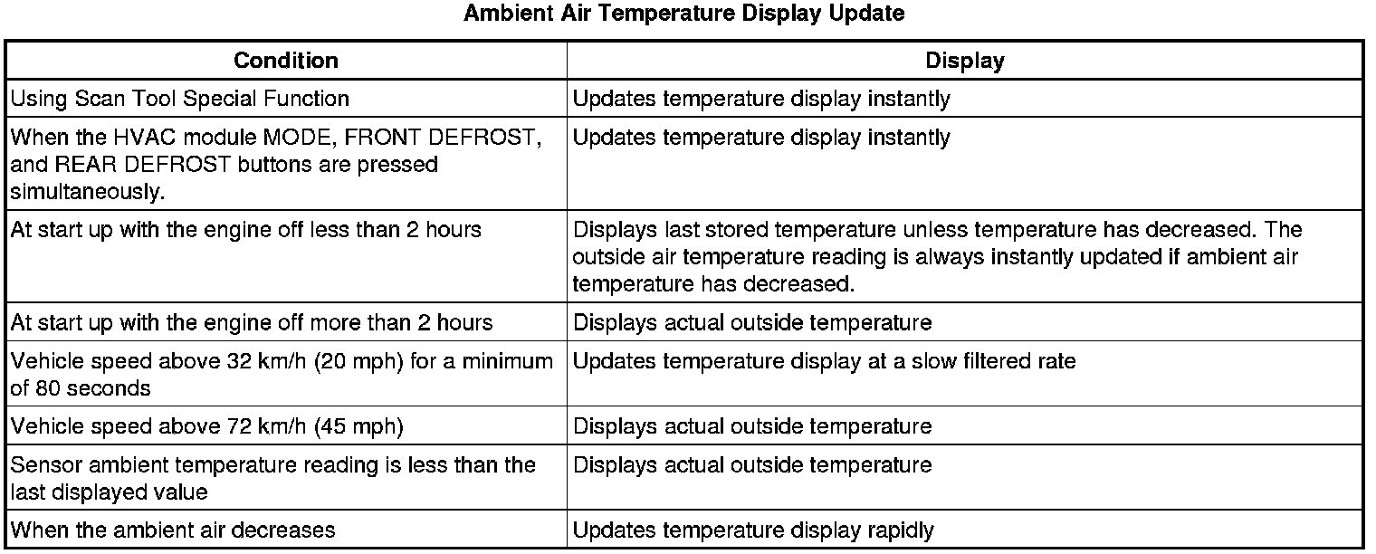 1. Measure actual outside air temperature using a thermometer. Compare this value to the scan tool Outside Air Temp. Raw parameter. The measured temperature should be within 5 degrees of parameter.