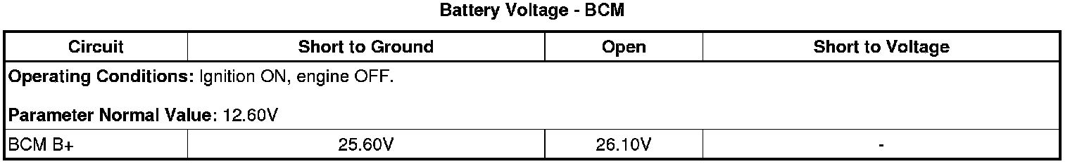 1. Ignition ON, observe the scan tool BCM Battery Voltage parameter. The reading should be equal to B+ voltage.