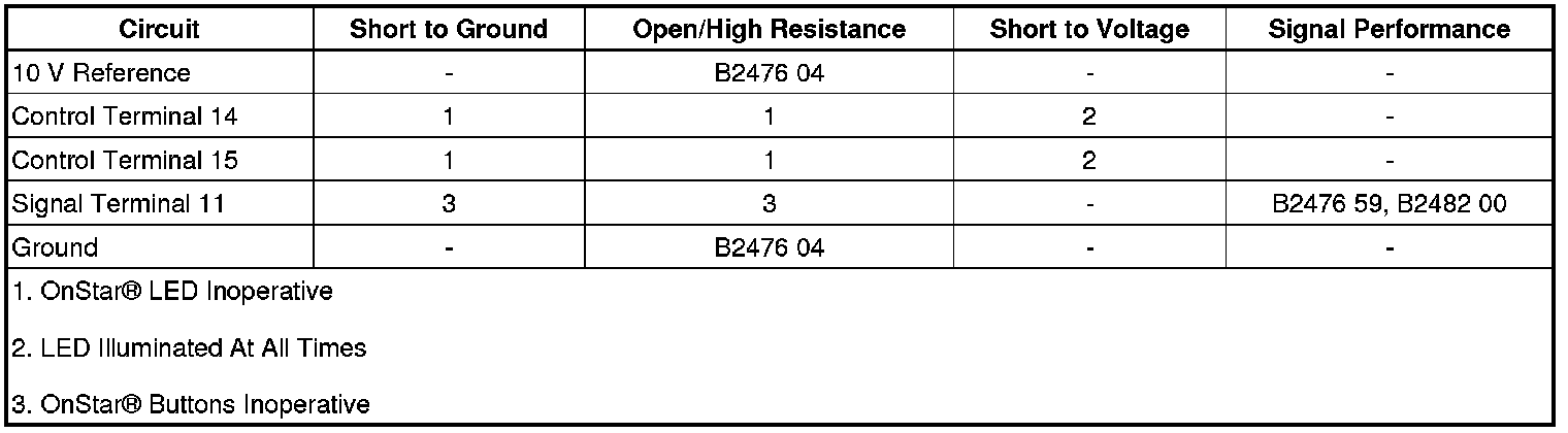 The OnStar(R) button assembly consists of 3 buttons: Call/Answer, OnStar(R) Call Center, and OnStar(R) Emergency. The telematics communication interface control module supplies the OnStar(R) button assembly with 10 V via the 10 V reference circuit. Each of the buttons, when pressed, completes the circuit across a resistor allowing a specific voltage to be returned to the telematics communication interface control module over the keypad signal circuit. Depending upon the voltage range returned, the telematics communication interface control module is able to identify which button has been pressed.