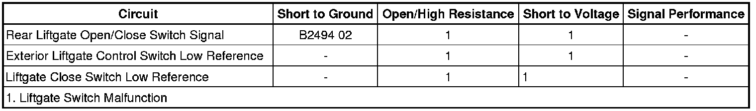 The liftgate control module will ignore the signal from the liftgate handle switch and the liftgate close switch. Normal power liftgate operation will be available from the interior liftgate control switch or from a request from the remote keyless entry module.