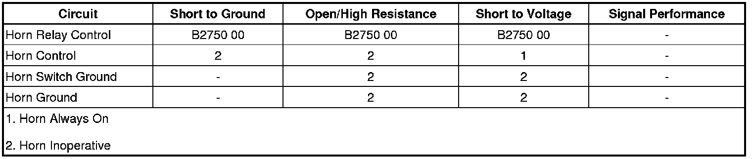 The BCM detects a short to ground, open or short to battery in the horn relay control circuit for approximately 125 milliseconds.