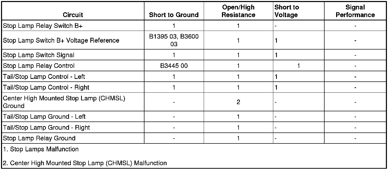 The BCM detects a short to ground in the CHMSL control circuit when the stop lamps are being commanded ON.