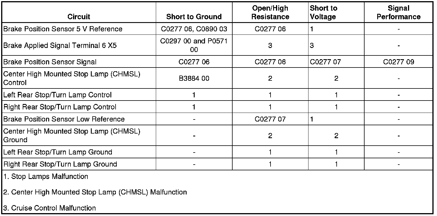 The brake pedal position sensor is used to sense the action of the driver application of the brake pedal. The brake pedal position sensor provides an analog voltage signal that will increase as the brake pedal is applied. The body control module (BCM) provides a low reference signal and a 5 V reference voltage to the brake pedal position sensor. When the variable signal reaches a voltage threshold indicating the brakes have been applied, the BCM will apply battery voltage to the right and left stop lamp control circuits, transmission control module (TCM), engine control module (ECM), and center high mounted stop lamp (CHMSL) control circuit.