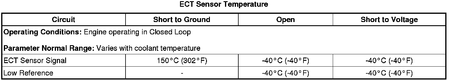 * This diagnostic runs in a specific range. Measure and record the resistance of the ECT sensor at various ambient temperatures between -7 to +80°C (+19 to +176°F), then compare those measurements to the Temperature Versus Resistance Temperature Versus Resistance table.