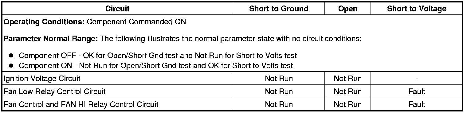 2. Command the cooling fans ON and OFF at high speed while observing the scan tool circuit test status parameters listed below: