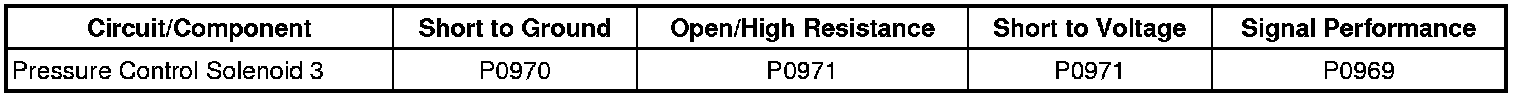 The Transmission Control Module detects an open or short to voltage on the PC solenoid 3 control circuit for 1 second.