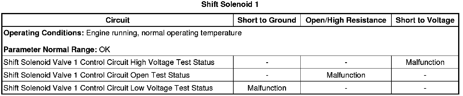 The control solenoid valve assembly detects an internal low voltage electrical malfunction of the shift solenoid 1 control circuit when the shift solenoid 1 is commanded OFF for 2 seconds.