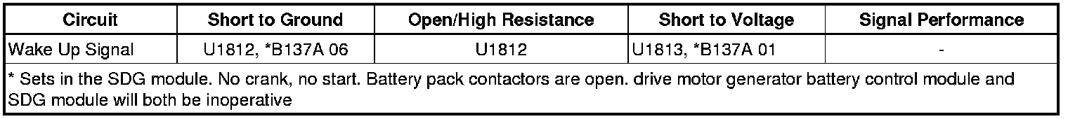 The serial data gateway (SDG) module translates serial data messages between the high speed GMLAN serial data bus, the low speed GMLAN serial data bus, and the high speed hybrid GMLAN serial data bus. Messages between the drive motor generator battery control module and the other hybrid system control modules must pass thru the SDG module. The wake up circuit sends a voltage from the SDG module to the drive motor generator battery control module to initiate certain module functions. DTC U1813 is set by the drive motor generator battery control module, but is stored in and reported by the hybrid powertrain control module (HPCM).