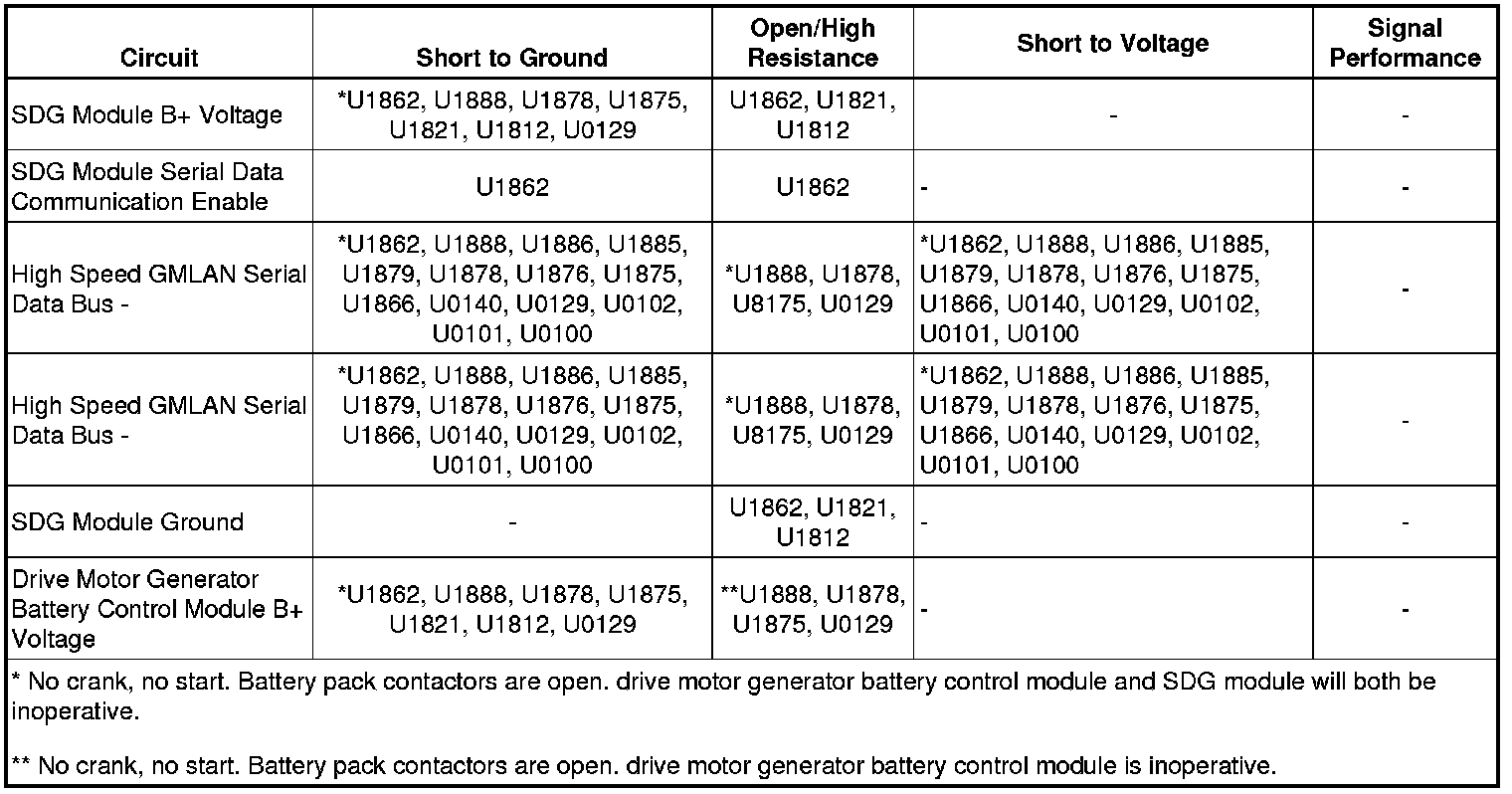 * If serial data is lost between the SDG module and the drive motor generator battery control module multiple modules will set loss of communication DTCs against the drive motor generator battery control module.