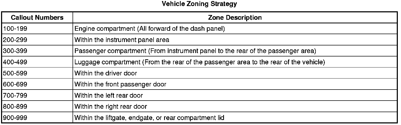 All grounds, in-line connectors, and splices have identifying numbers that correspond to where they are located in the vehicle. The following table explains the numbering system.