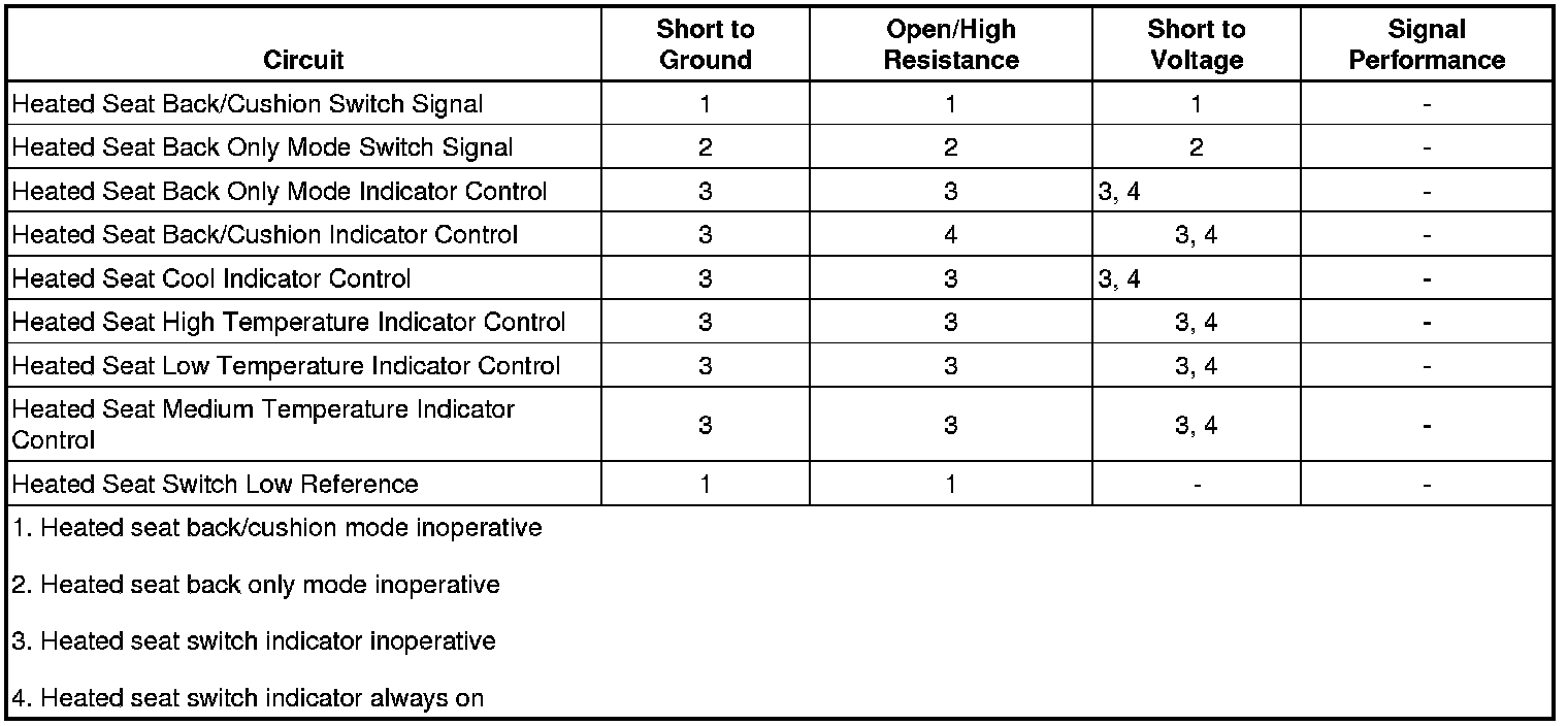 3. If all heated seat functions operate normal and the heated seat switch indicators do not illuminate, refer to the Heated Seat Switch Indicators component test.