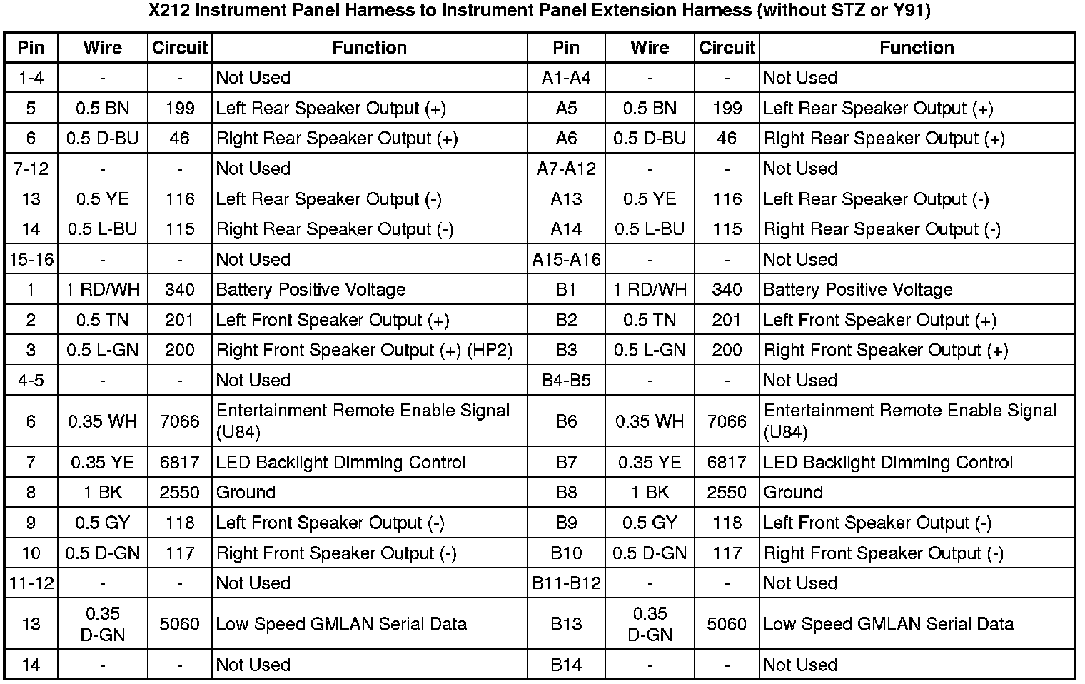X212 Instrument Panel Harness to Instrument Panel Extension Harness (without STZ or Y91)