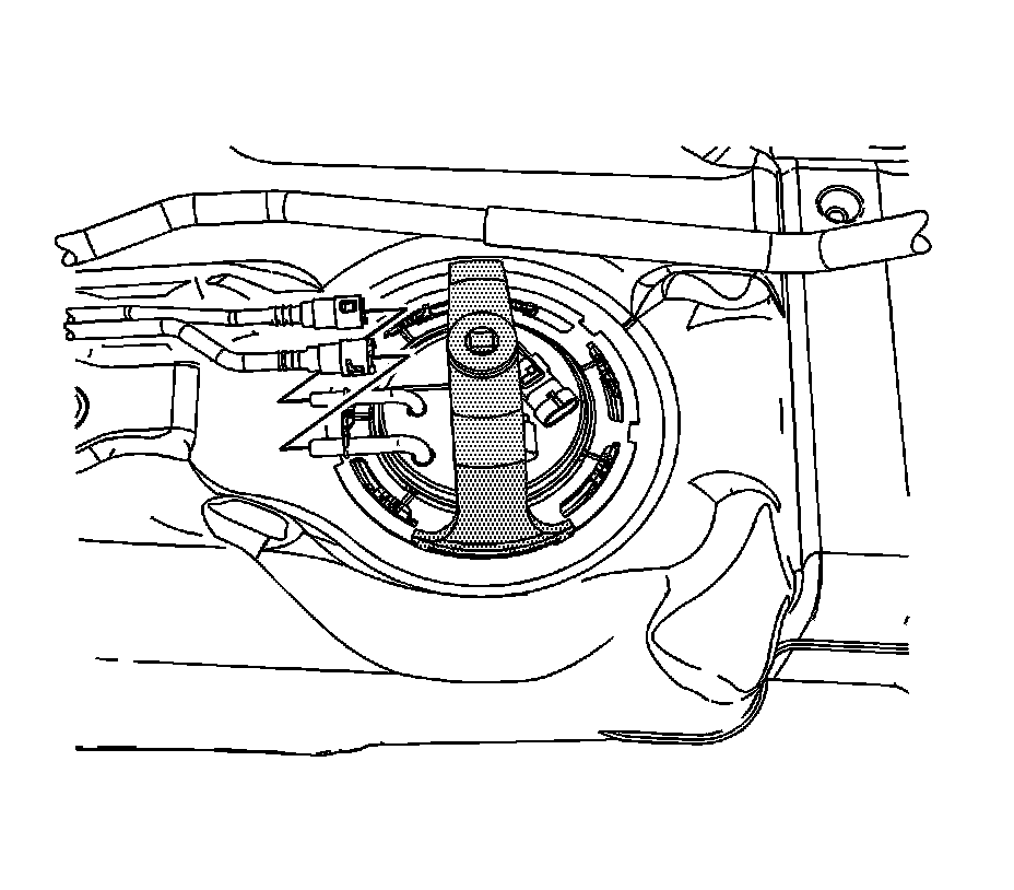 2. Disconnect fuel and evaporative emission (EVAP) lines from the fuel tank module. Refer to Plastic Collar Quick Connect Fitting Service Procedures.
