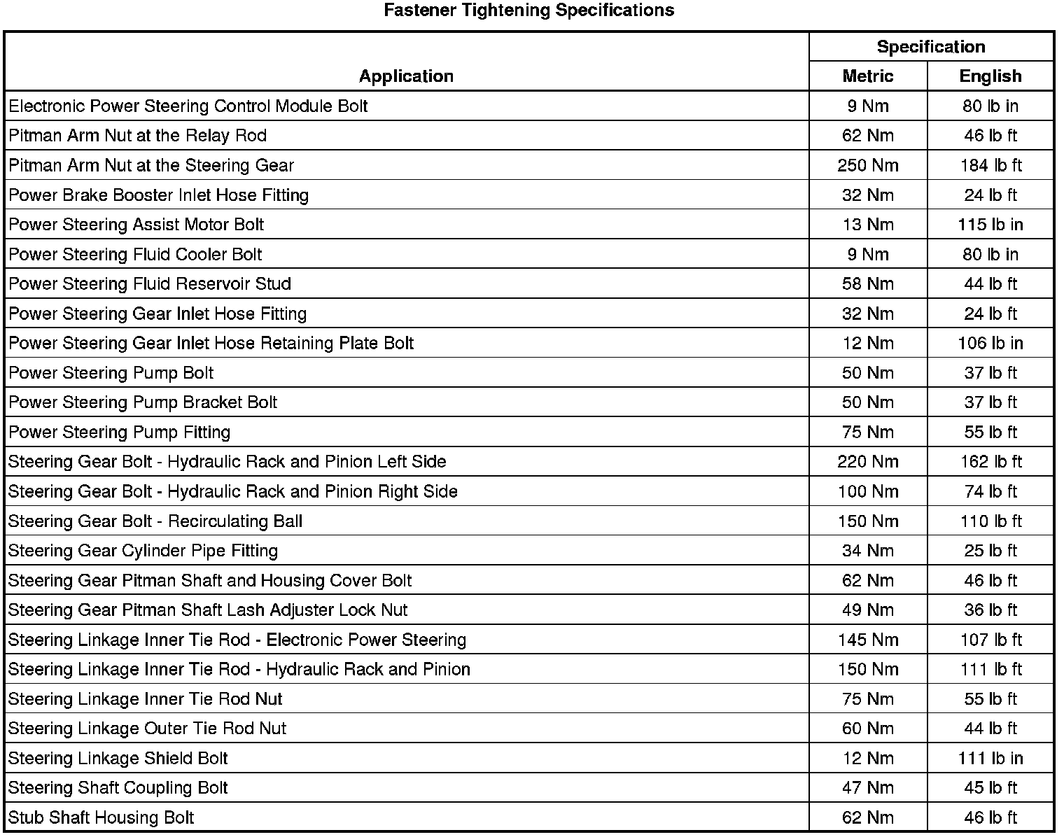 Fastener Tightening Specifications
