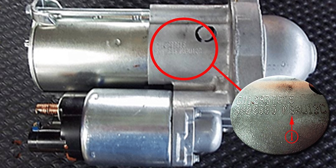 A flash light and mirror are required to view the starter motor date code. Suspect starters will have an alpha-numeric code of M8AU12C or M9AU12A. Do NOT use starters with these alpha-numeric codes.