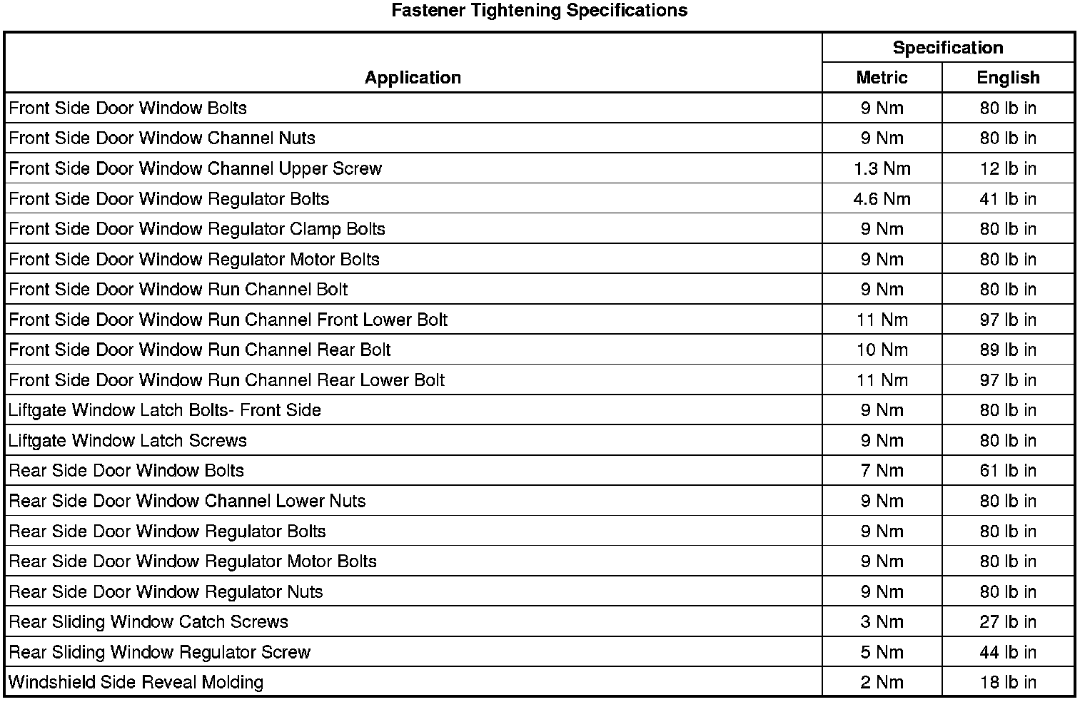 Fastener Tightening Specifications