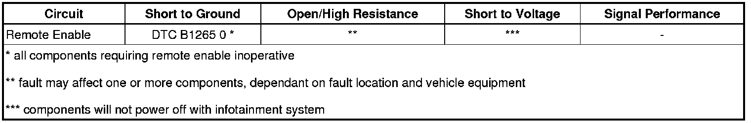 * The radio's current limiting logic will not re-enable the output on the entertainment remote enable circuit until after the radio performs a full power-down. It may be necessary to wait 5 minutes with the key OFF and retained accessory power OFF for the radio to re-enable this output.