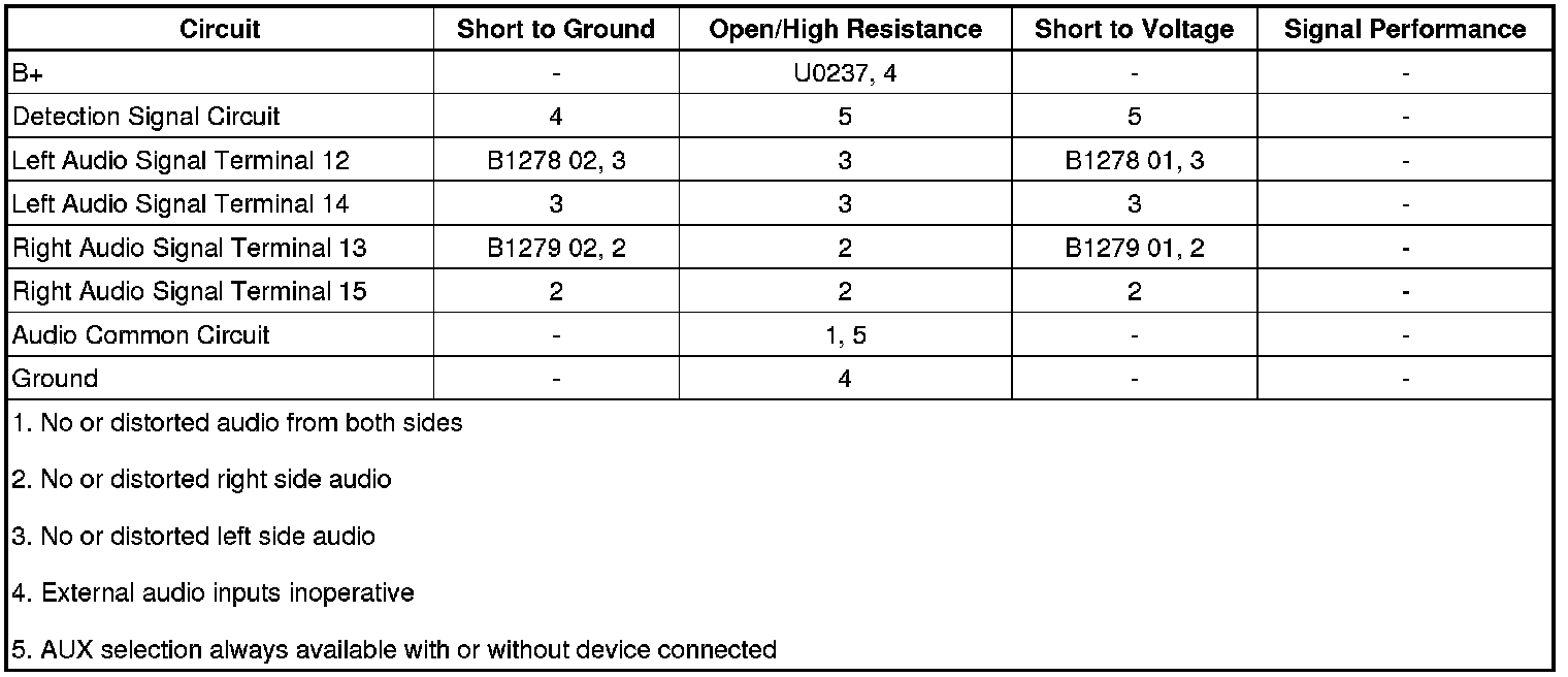 * The multimedia player interface module detects a short to battery on either of the audio signal circuits from the auxiliary audio jack.