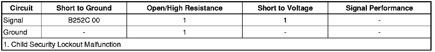 The BCM has detected a short to ground on the child security lockout switch signal circuit for greater than 60 seconds.
