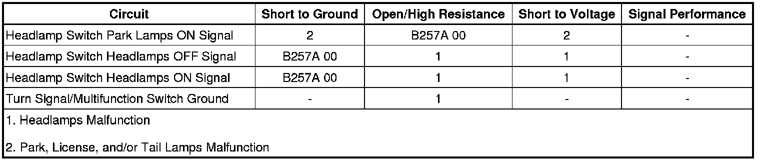 * When DTC B257A 00 is present on the headlamp switch park lamps ON signal circuit, the park lamps and low beam headlamps are inoperative in the PARK and HEAD positions. Headlamps and park lamps operate in AUTO position.