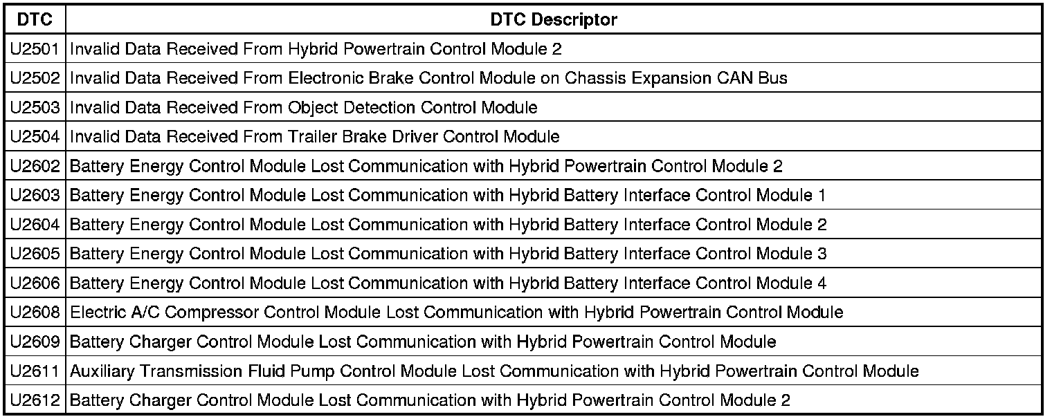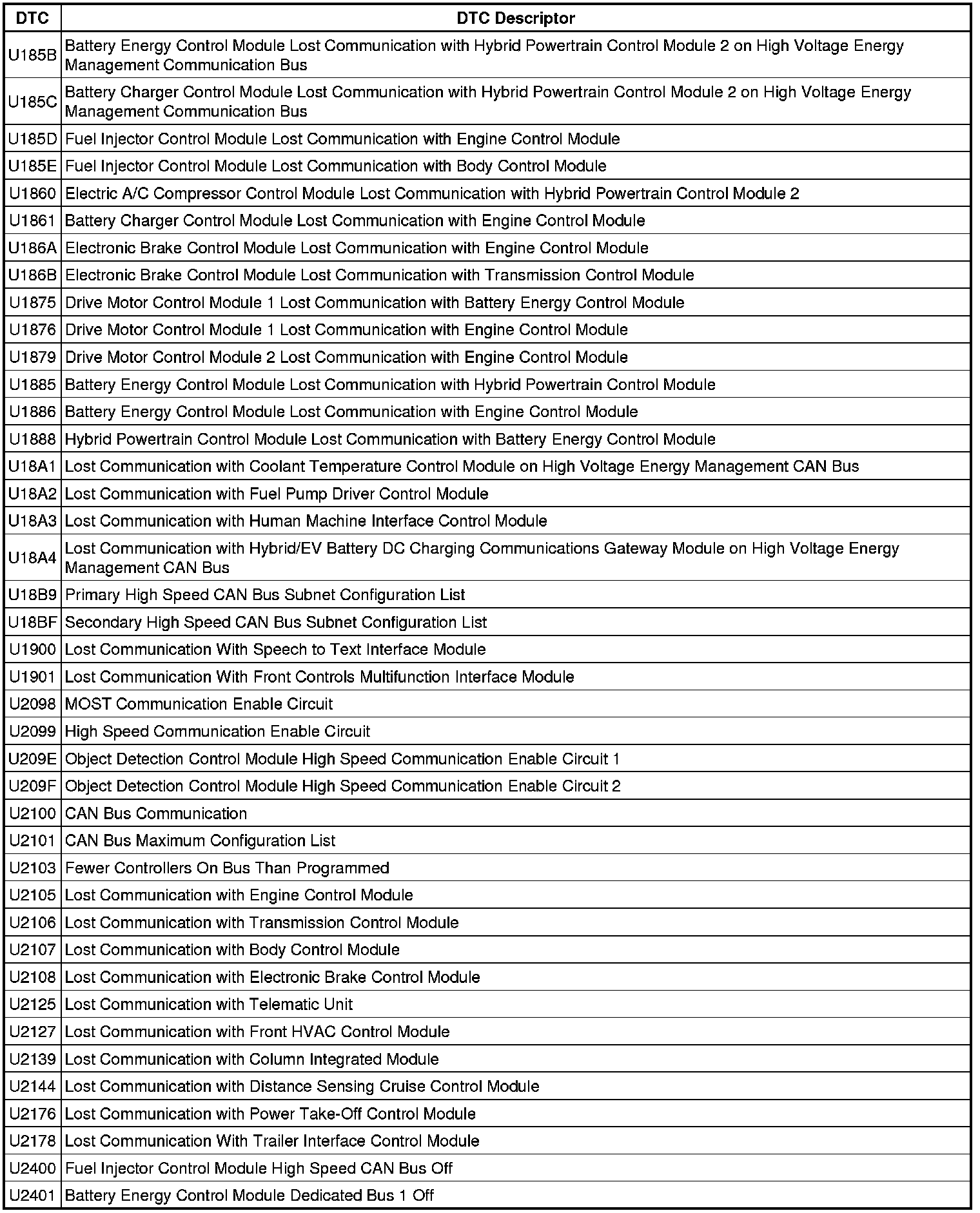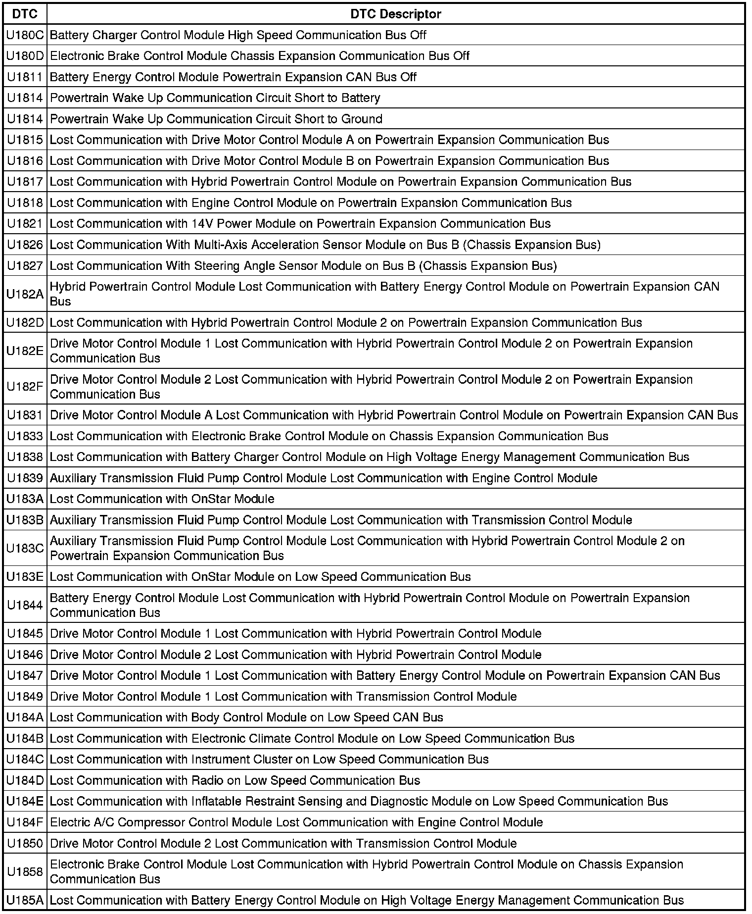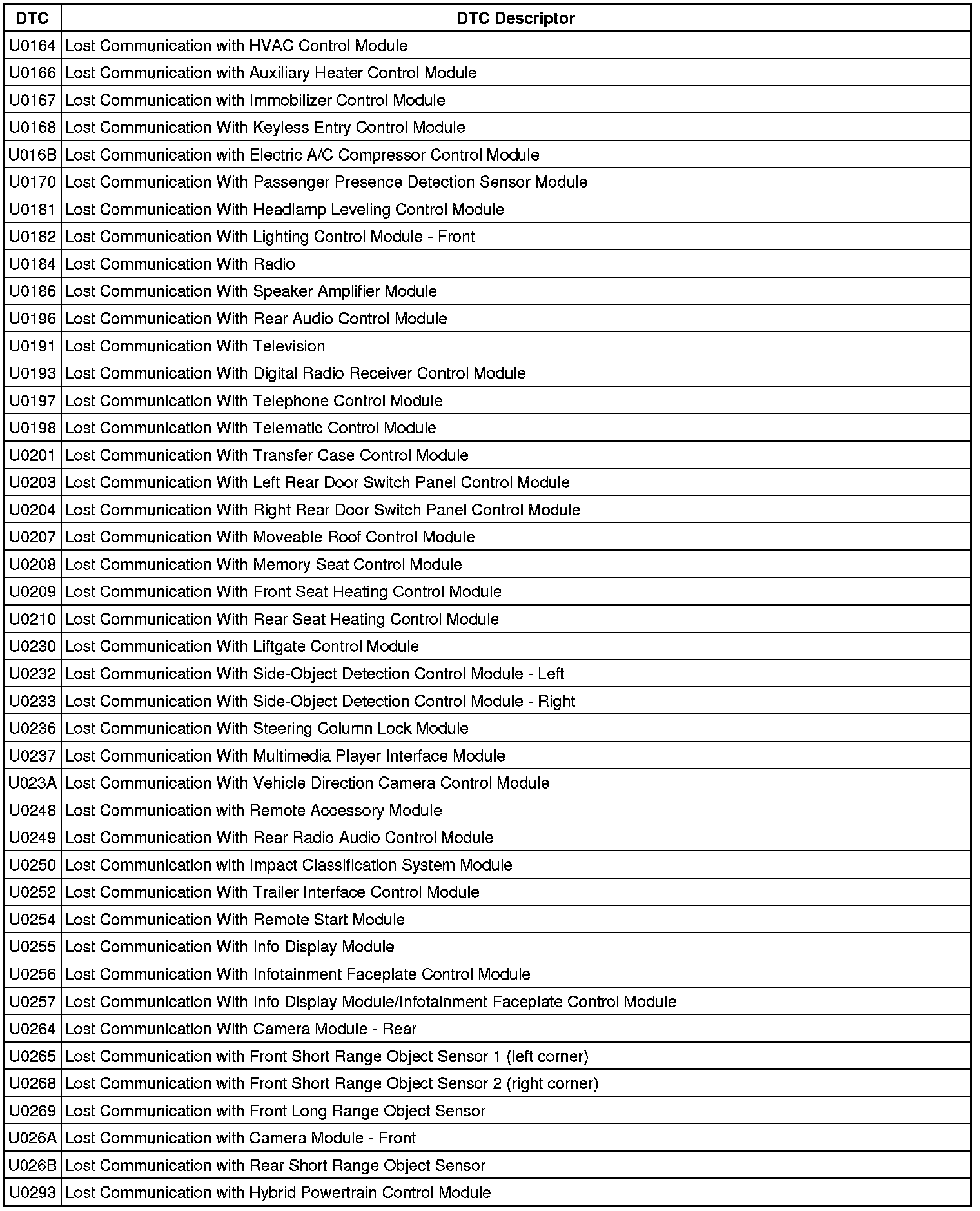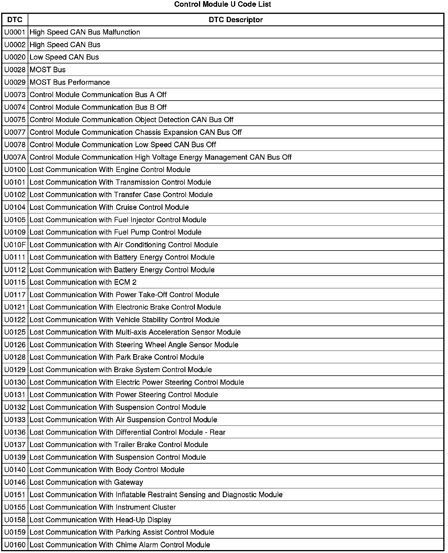 This list includes all Data Communications related U-code DTCs in alphanumeric order with descriptors for all devices. Not all DTCs listed will be applicable to all vehicles.