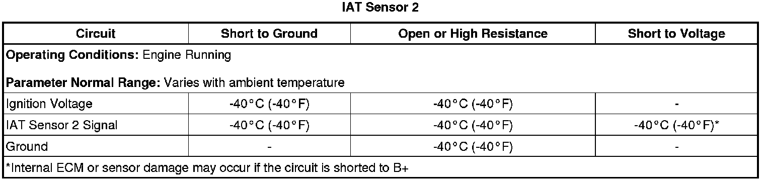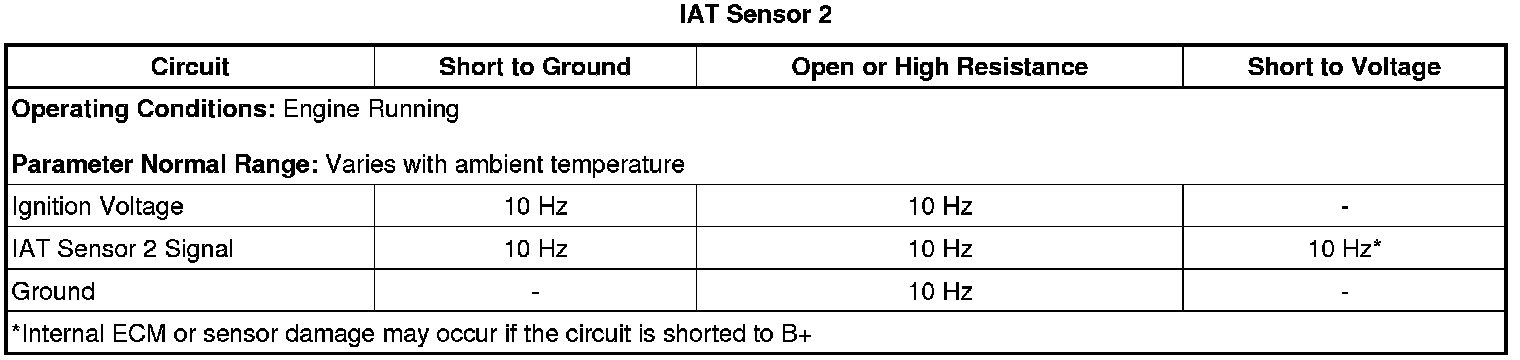 The ECM detects that the IAT sensor 2 signal is greater than 390 Hz, warmer than 150°C (302°F), for greater than 5 s.