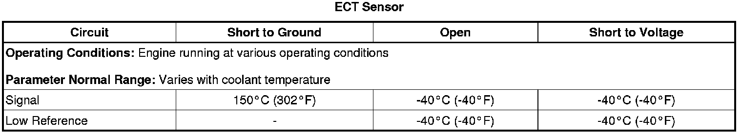 2. Verify the scan tool ECT Sensor parameter is between -39 to + 120°C (-38 to +248°F) and changes with engine run time.