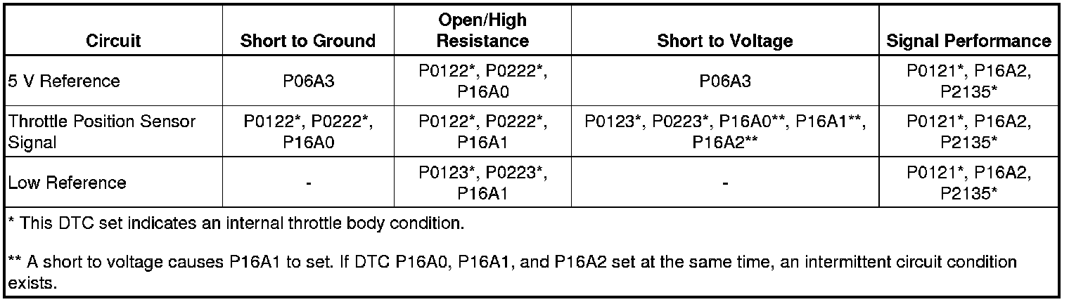 * DTCs P0122, P0123, P0222, P0223, P16A0, P16A1, P16A2, and P2135 are Type A DTCs.