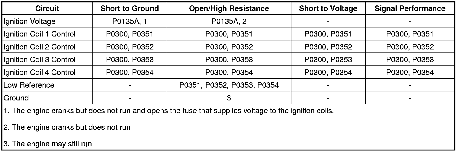 The ignition system on this engine uses an individual coil for each cylinder. The engine control module (ECM) controls the spark event for each cylinder through the individual ignition coil control circuits. When the ECM commands the ignition control circuit ON, electrical current will flow through the primary winding of the ignition coil, creating a magnetic field. When a spark event is requested, the ECM will command the ignition control circuit OFF, interrupting current flow through the primary winding. The magnetic field created by the primary winding will collapse across the secondary coil windings, producing a high voltage across the spark plug electrodes. The ECM uses information from the crankshaft position (CKP) sensor, and the camshaft position (CMP) sensor for sequencing and timing of the spark events. The ECM monitors each ignition control circuit for improper voltage levels. Each ignition coil has the following electrical circuits: