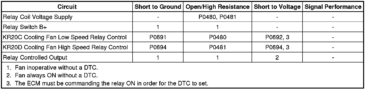 2. Engine operating, observe the DTC information with a scan tool. DTC P0480, P0481, P0691, P0692, P0693, or P0694 should not set.