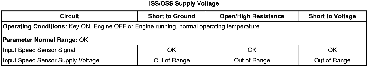 1. Ignition ON, verify with a scan tool the transmission ISS/OSS Supply Voltage test status parameter displays OK.