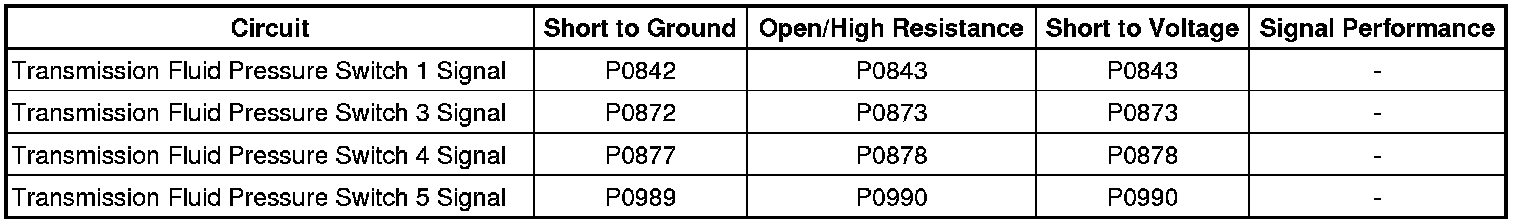 2. Verify with a scan tool, the Transmission Fluid Pressure Switch 1, Transmission Fluid Pressure Switch 3, Transmission Fluid Pressure Switch 4, and Transmission Fluid Pressure Switch 5 parameter states are correct for the Park, Reverse, and Neutral gear select lever positions. Refer to Transmission Fluid Pressure Switch Logic Transmission Fluid Pressure Switch Logic.