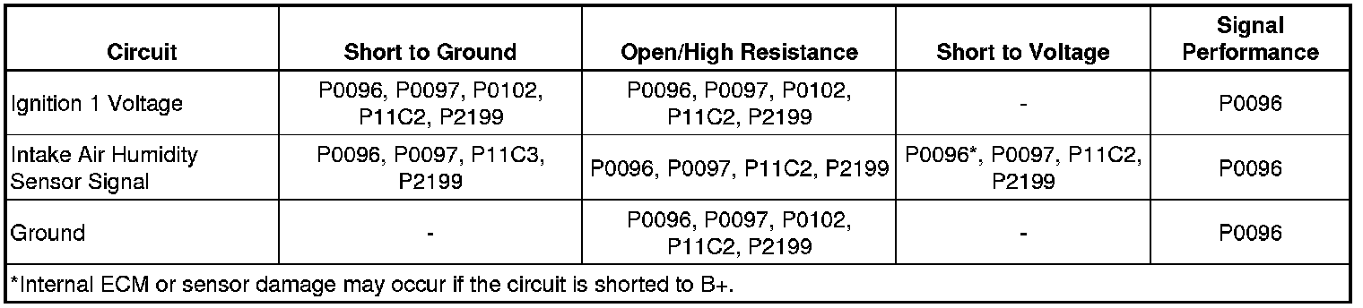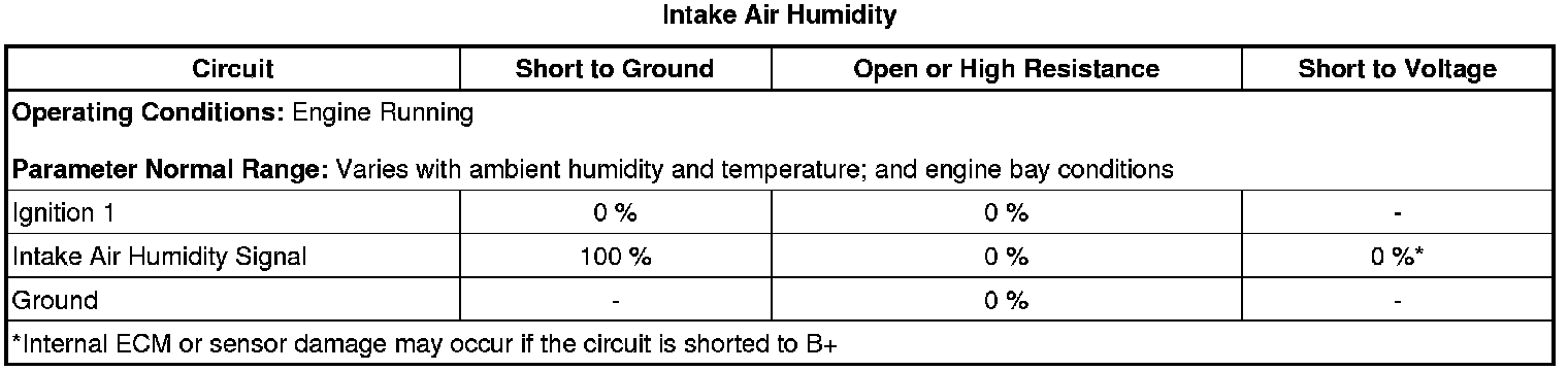 * The humidity sensor and the IAT sensor 2 signals are sent to the ECM on the same circuit. If the Intake Air Humidity parameter displays the value: 0 % or 100 %, and there are also IAT Sensor 2 DTCs, check for a circuit problem.