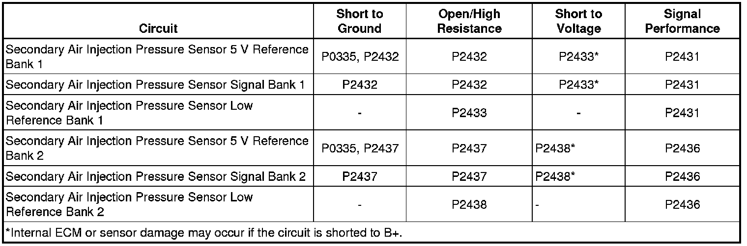 The ECM detects that a secondary air injection pressure sensor signal is less than 0.3 V for greater than 6 s.