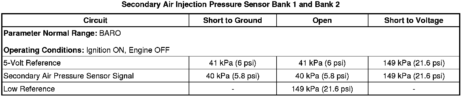 4. Verify the scan tool Secondary Air Injection Pressure Sensor Bank 1 (left hand) and Bank 2 (right hand) pressure parameters are within 3 kPa (0.4 psi) of BARO.