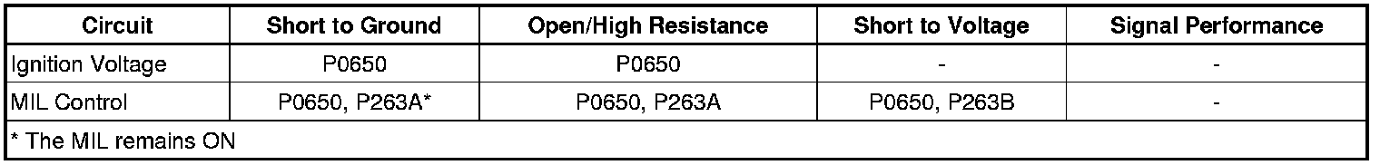 * If the ECM detects low voltage on the MIL control circuit during the MIL control circuit driver OFF state, DTCs P0650 and DTC P263A may set simultaneously.