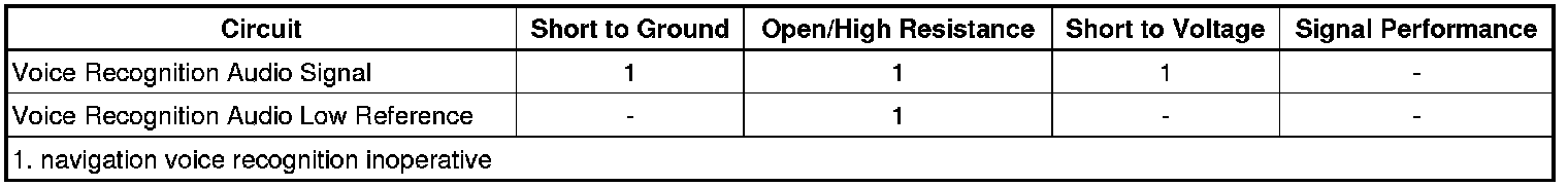 When voice recognition for the navigation equipped infotainment system is started, voice signals from the cellular phone microphone are passed through the telematics communication interface control module to the radio via the voice recognition audio circuits.