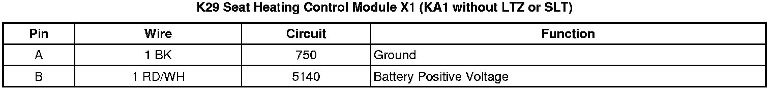 K29 Seat Heating Control Module X1 (KA1 without LTZ or SLT)