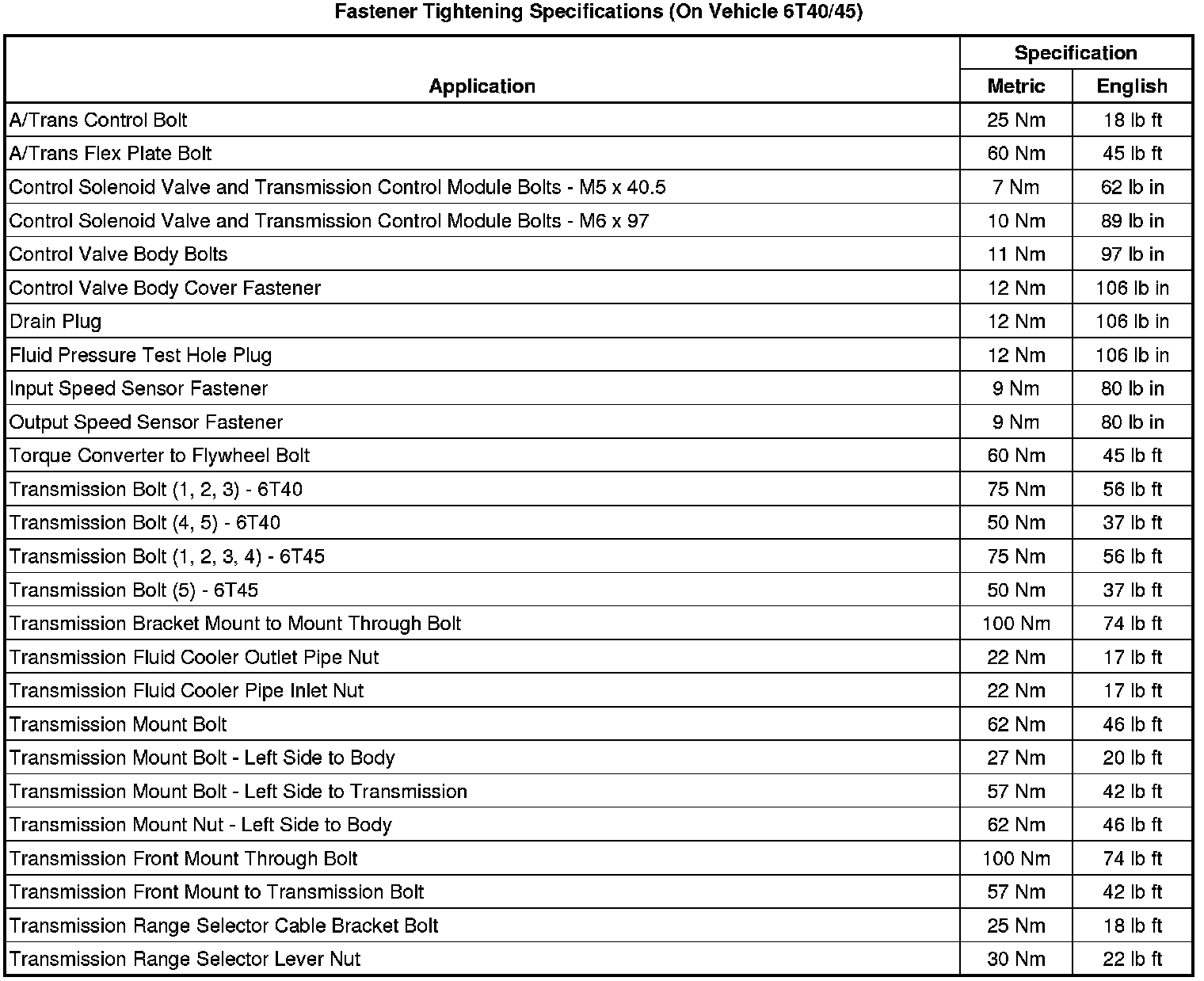 Fastener Tightening Specifications (On Vehicle 6T40/45)