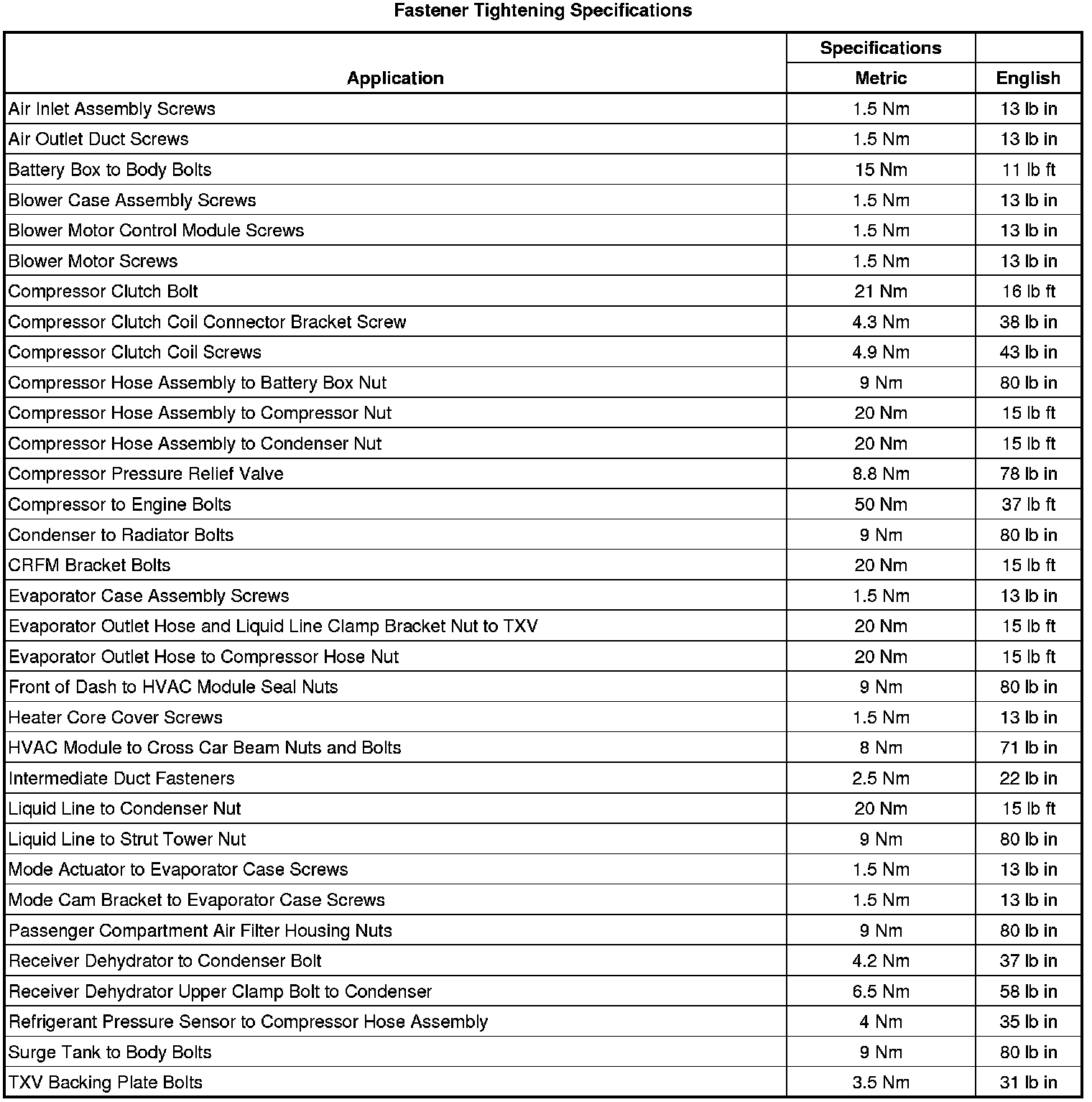 Fastener Tightening Specifications
