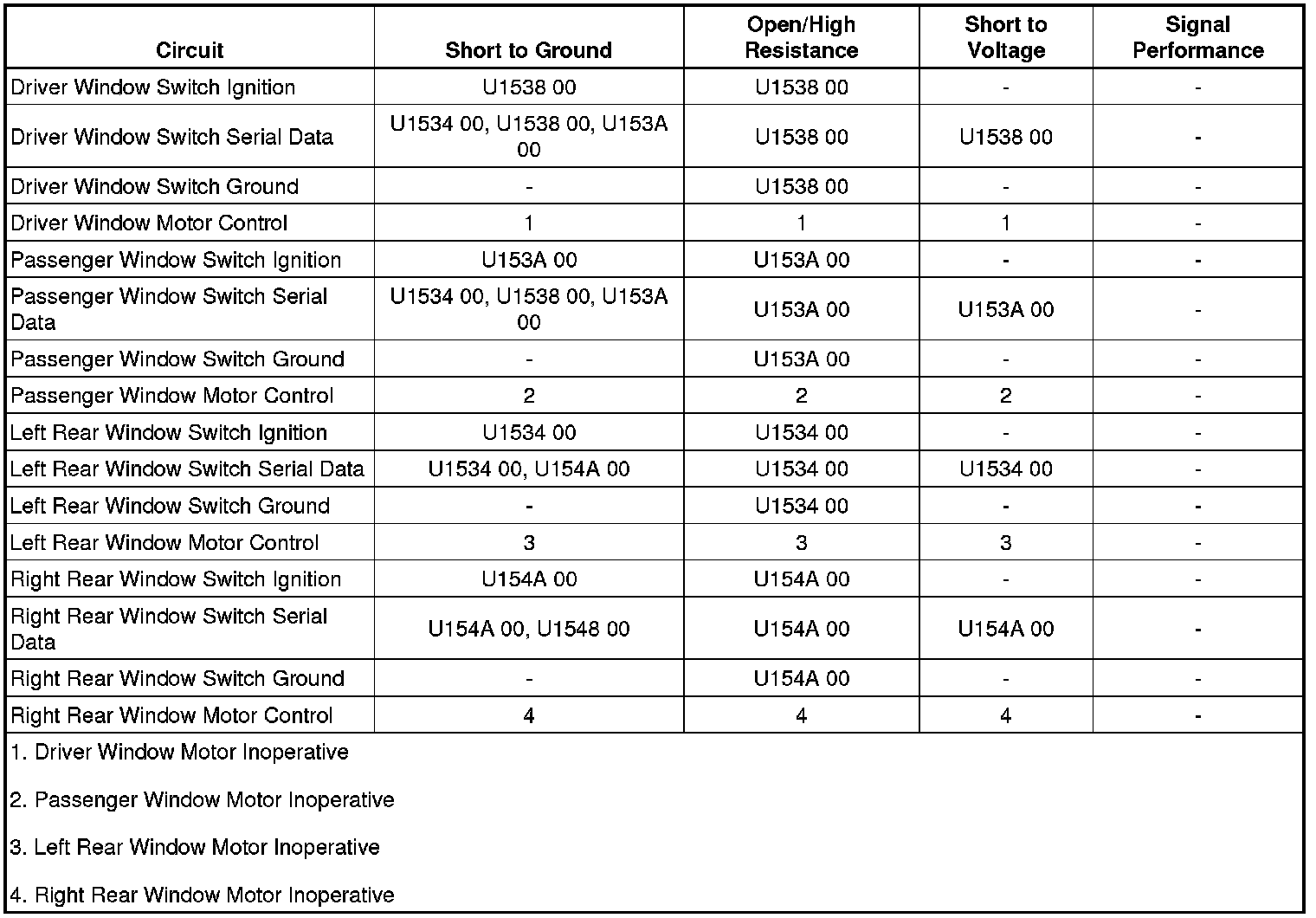 2. Verify the driver, passenger, left rear and right rear window functions while commanding the Driver Window Motor, Passenger Window Motor, Left Rear Window Motor and Right Rear Window Motor Up and Down with a scan tool.