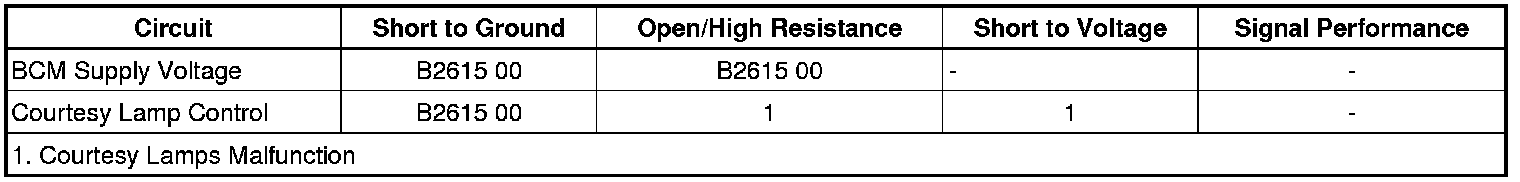 Battery voltage for the courtesy lamps is supplied at all times, from the BCM 3 fuse located in the underhood fuse block, to the body control module (BCM). When the BCM receives a signal to command the courtesy lamps ON, it applies voltage through the courtesy lamps supply voltage circuits to the courtesy lamps listed below.