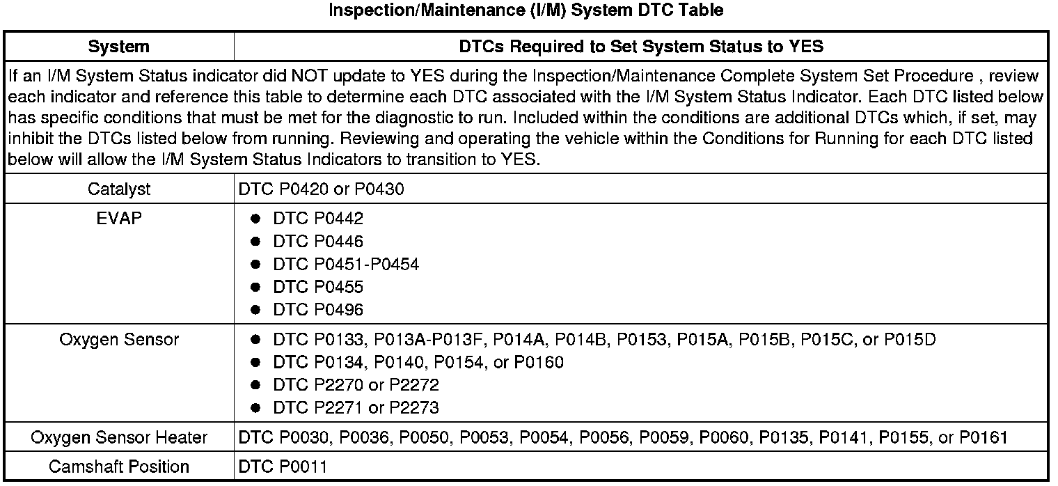 Inspection/Maintenance (I/M) System DTC Table